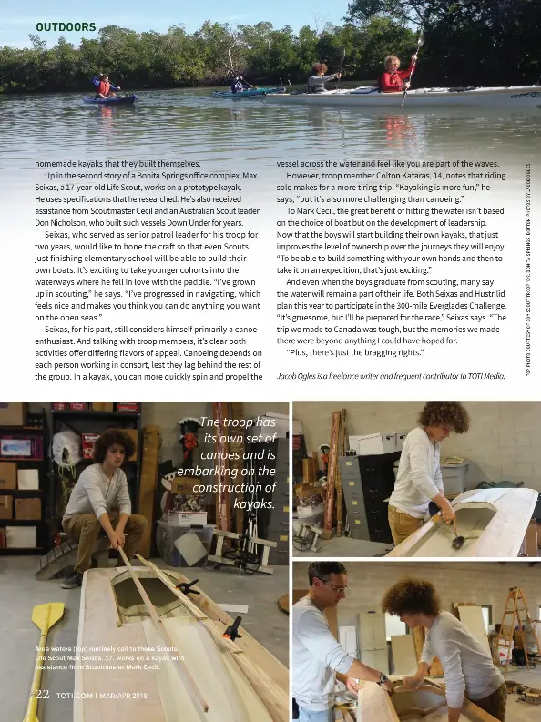 Up in the second story of a Bonita Springs office complex, Max Seixas, a 17-year-old Life Scout, works on a prototype kayak. He uses specifications that he researched. He’s also received assistance from Scoutmaster Cecil and an Australian Scout leader, Don Nicholson, who built such vessels Down Under for years.