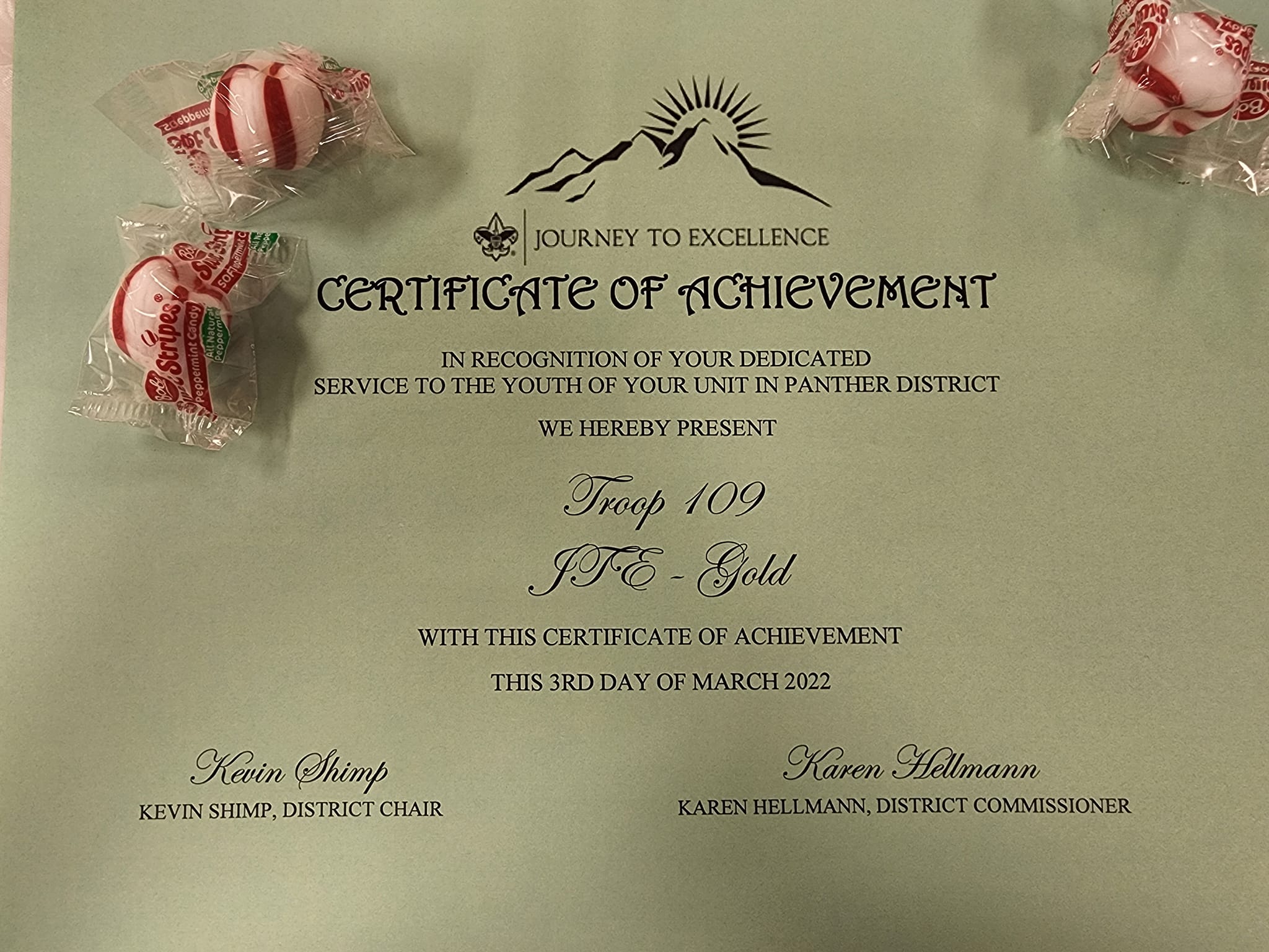 - March 3rd – Leader Recognition Dinner saw Troop 109 awarded the JTE Certificate of Achievement and David Schmitt was recognized for his service to Troop 109 and Scouts BSA. We appreciate all our leaders hard work, time and dedication to Scouts and the Troop. Thank You!!!