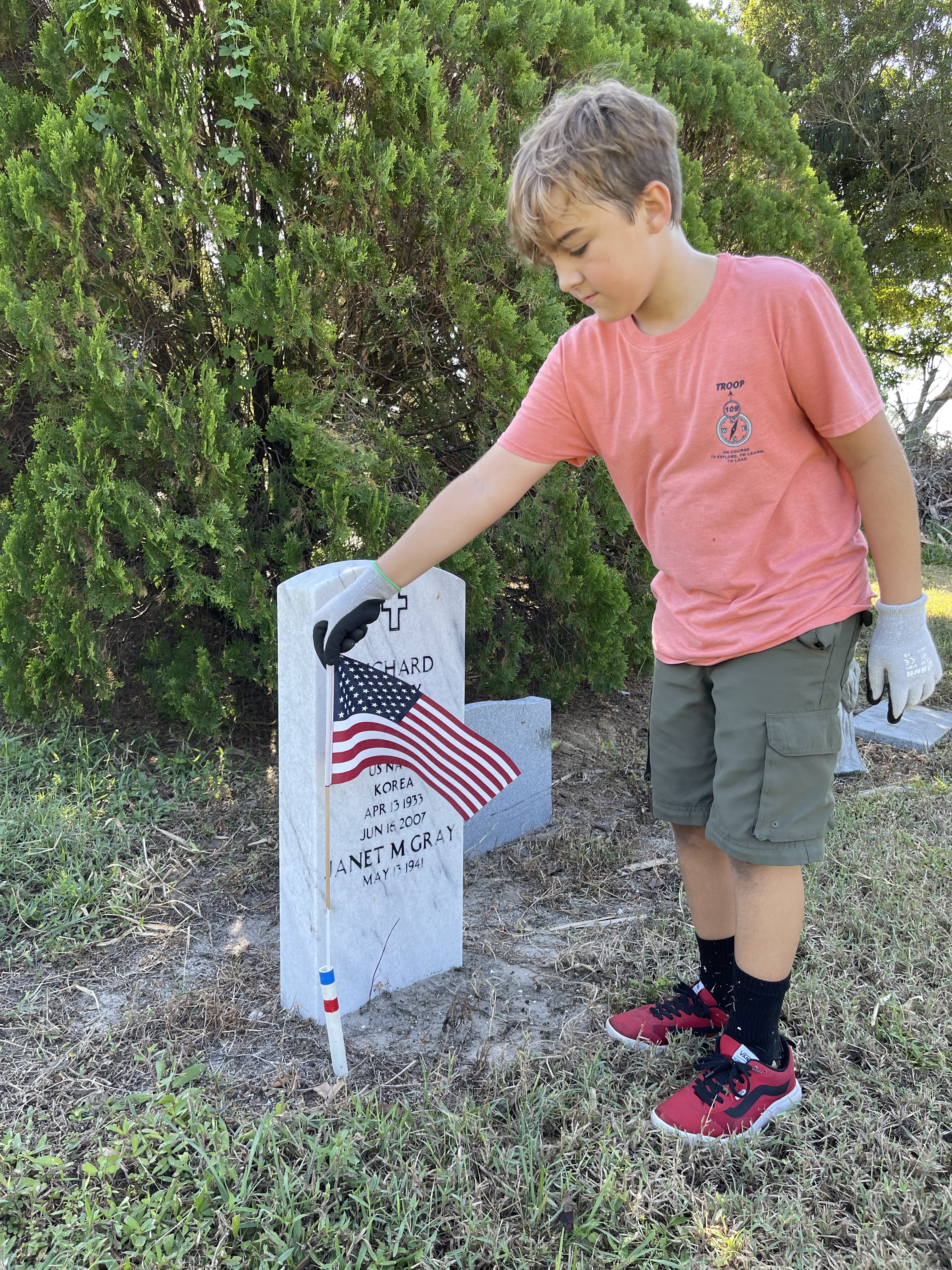 - November 5th, 2022 – Troop 109 worked at the Bonita Springs Cemetery doing some more cleanup and placing all the Veterans Day Flags.