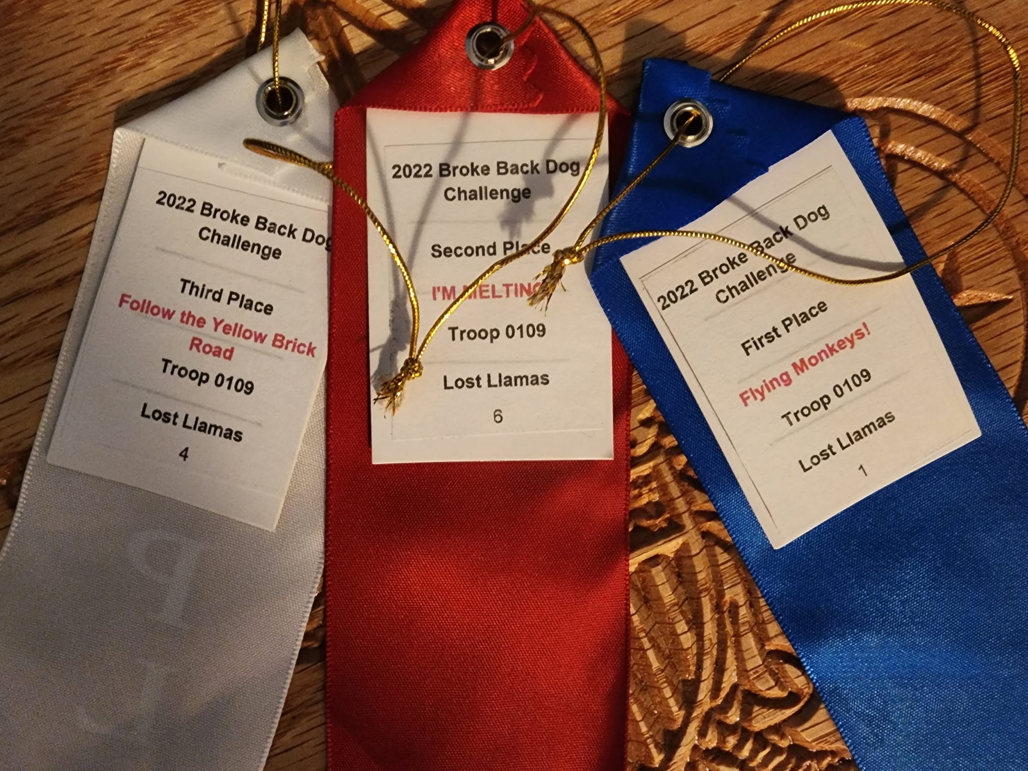 - December 2nd-4th, 2022 – Lost Llamas showed their scout spirit at the Broke Back Dog Challenge and led Troop 109 to victory!